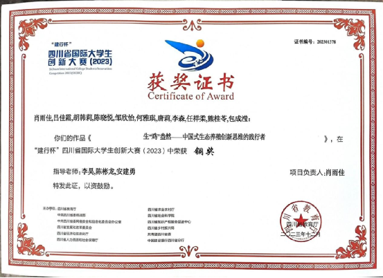 3、2023年12月获得第九届四川省国际“互联网+”大学生创新创业省级金奖。