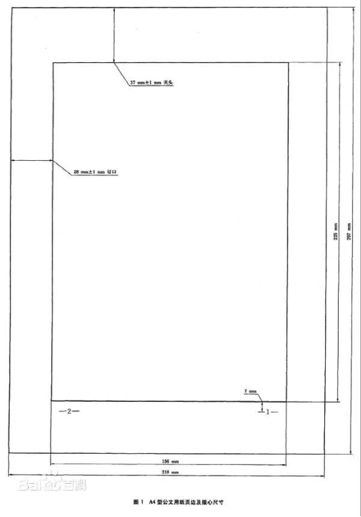 公文用纸天头(上白边)为37 mm±1 mm,公文用纸订口(左白边)为28mm±1mm,版心尺寸为156 mm×225 mm.