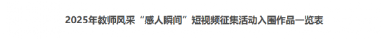 ½üÈÕ£¬½ÌÓý²¿¹«²¼2025ÄêÐÂʱ´ú½Ìʦ·ç²É¶ÌÊÓÆµÕ÷¼¯»î¶¯ÓÅʤ×÷Æ·ºÍÈëΧ×÷Æ·Ãûµ¥£¬ÎÒÔº±¨Ë͵Ä×÷Æ·¡¶Î¢¹â³É¾æ£¬Öý»êÓýÈË¡·£¬´ÓÈ«¹ú2300ÓಿÕ÷¼¯×÷Æ·ÖÐÍÑÓ±¶ø³ö£¬³É¹¦½øÈëÈëΧ×÷Æ·Ãûµ¥¡£