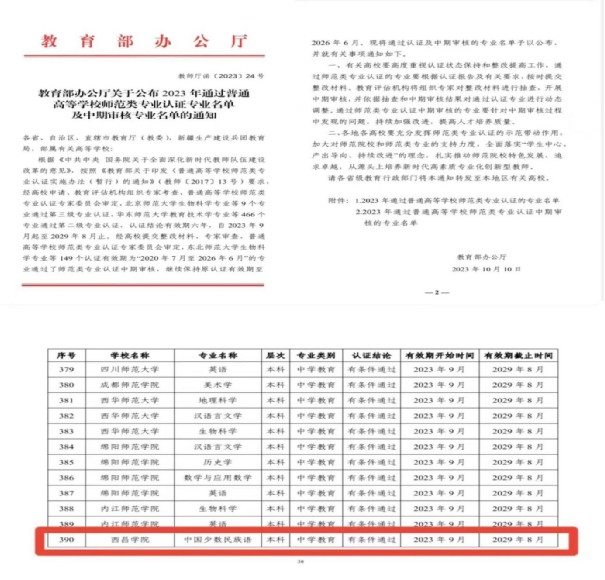 近日,根据教育部办公厅发布的《2023年通过普通高等学校师范类专业认证专业名单及中期审核专业名单的通知》(教师厅函〔2023〕24号),彝语言文化学院中国少数民族语言文学专业通过了中学教育第二级认证,认证结论有效期六年(2023年9月-2029年8月),该专业也是西昌学院首批申请并率先通过教育部师范类专业二级认证的专业。